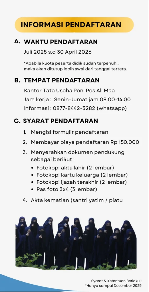 Untuk Tahun Ajaran 2026–2027, Al-Maa kembali membuka Penerimaan Santri Baru, dengan sistem pendidikan yang dirancang bukan hanya untuk membentuk santri yang taat beragama, tetapi juga siap hidup mandiri dan produktif di tengah tantangan zaman.
